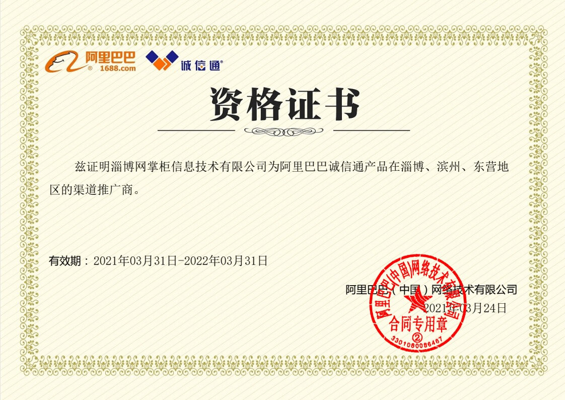 阿里巴巴诚信通淄博滨州东营授权渠道商证书
